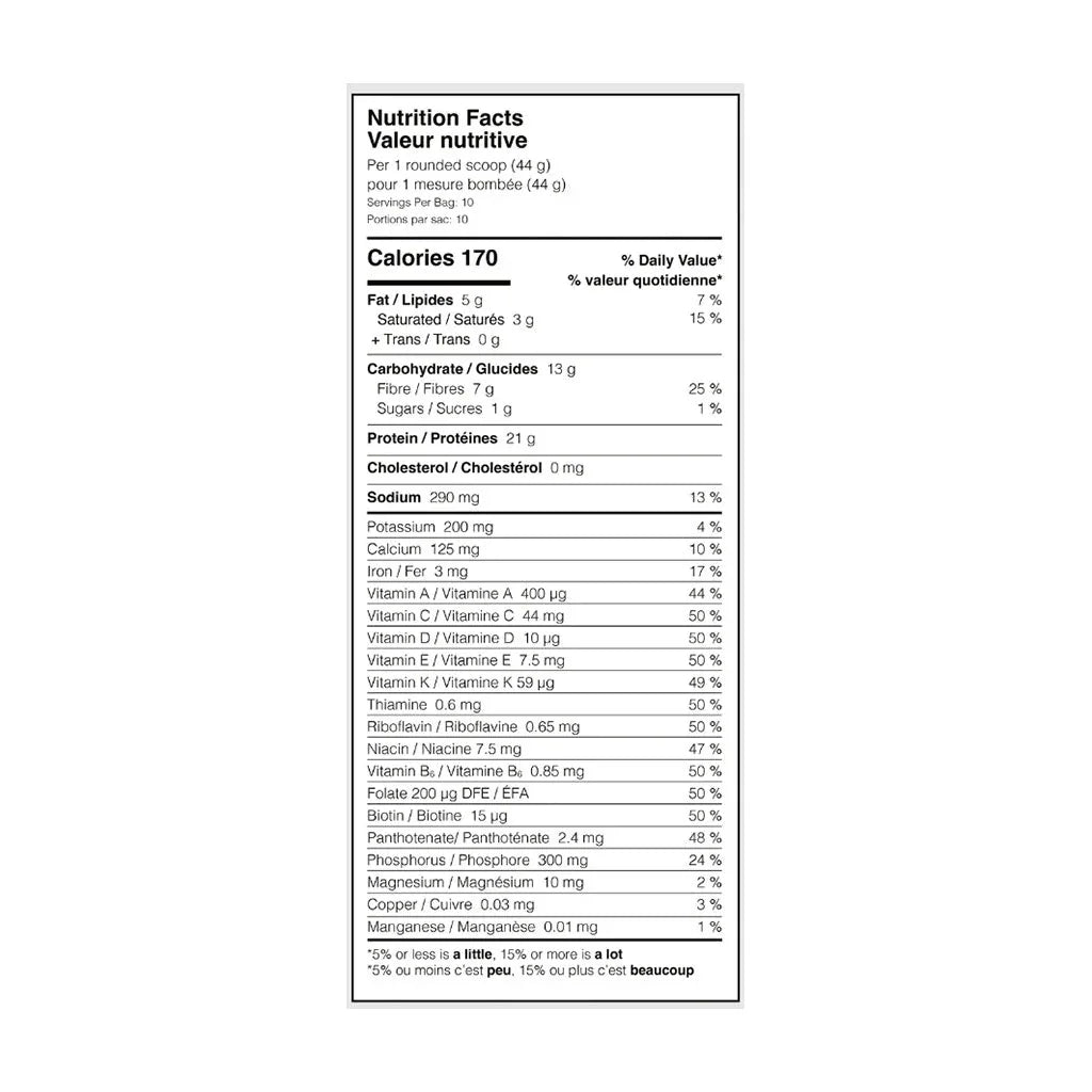 Protein blend (pea protein, ground golden linseed), Natural flavors, Soluble tapioca fiber, Coconut milk powder* (coconut milk powder*, tapioca maltodextrin*, acacia gum*), Alkalized cocoa powder, Medium-chain triglycerides (medium-chain triglycerides from coconut oil, tapioca maltodextrin), Acacia gum, Guar gum, Xanthan gum, Mixed fruits, vegetables and mushrooms (spinach, broccoli, carrot, sweet potato, orange, apple, strawberry, sunflower seed, shiitake mushroom, maitake mushroom, pomegranate juice powder*, acai juice powder*, goji juice powder*, grape juice powder*, amla fruit powder*, cranberry powder*, aronia powder*, sea buckthorn juice powder*, camu camu powder*, acerola juice powder*), Rebaudioside M, Salt , Bacterial culture and enzyme mix (rice maltodextrin, Bacillus subtilis, bromelain, papain).