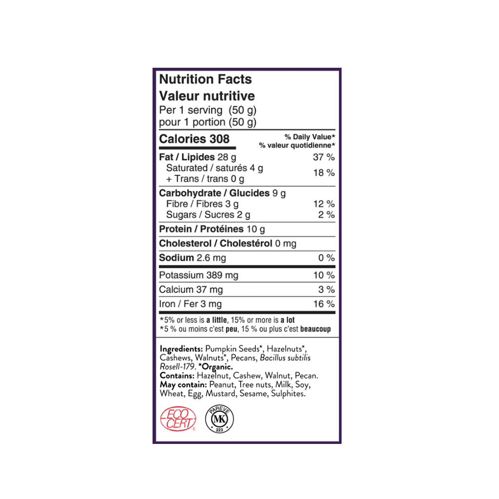Organic pumpkin seeds, organic hazelnuts, cashew nuts, organic walnuts, pecans, Bacillus subtilis Rosell-179.