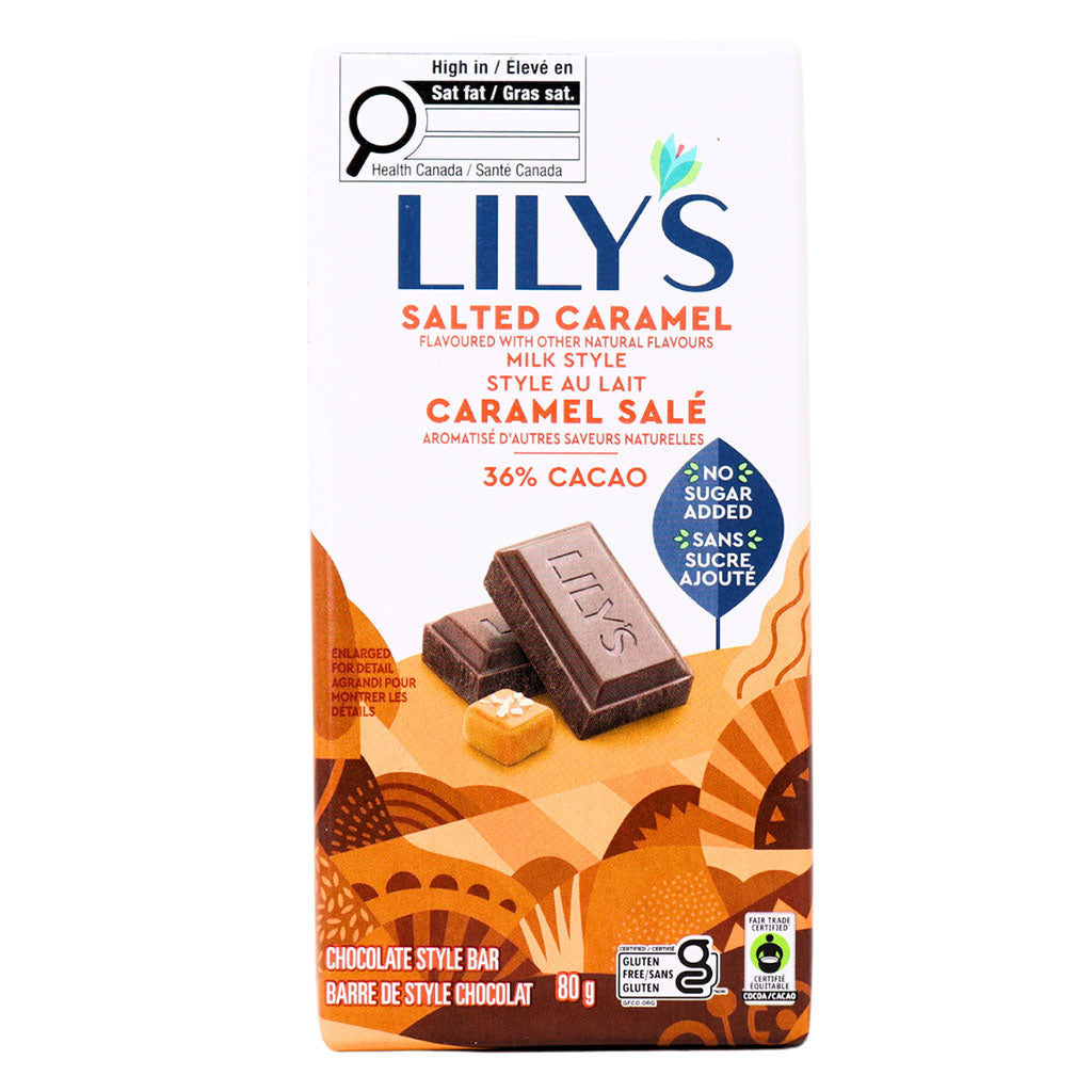 La barre chocolatée au lait et au caramel salé Lily's Sweets est édulcorée avec du stévia. Compatible avec la diète cétogène (keto), elle contient 36% de cacao. À savourer avec gourmandise et sans culpabilité.