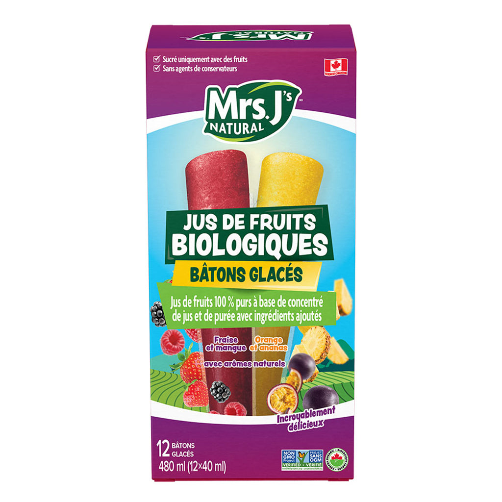 Les bâtonnets glacés aux fruits Mrs J's Natural sont préparés au Canada avec des ingrédients 100% biologiques. Dans chaque paquet, profitez de deux délicieuses saveurs fruitées : passion tropicale et explosion de baies.