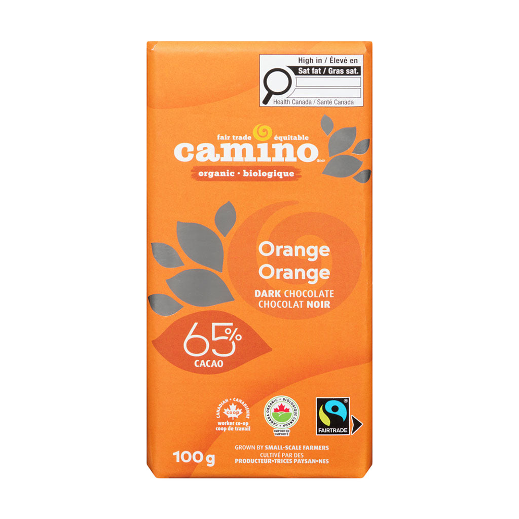 Biologique, équitable, et sans gluten, la tablette de Chocolat Noir Bio 65% à l'Orange de Camino marie parfaitement la fraîcheur de l'orange avec la richesse du chocolat.