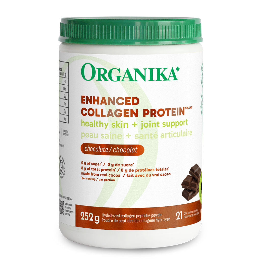 Le collagène enrichi à saveur de chocolat (Enhanced Collagen) d'Organika est une belle opportunité d'intégrer du collagène dans votre alimentation avec gourmandise. Le collagène aide à renforcer la santé de la peau, des cheveux et des ongles.