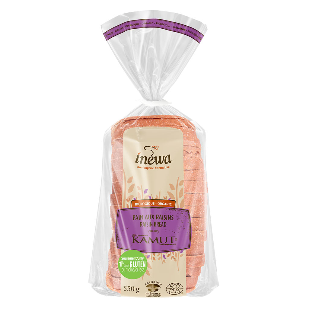 Ce pain aux raisins, faible en gluten, est proposé par la boulangerie alternative québécoise Inéwa. Fait avec de la farine de blé Kamut avec une subtile note de cannelle.