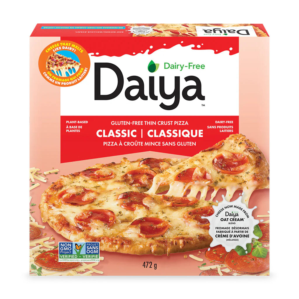 Croûte sans gluten (eau, amidon de tapioca, farine de riz, amidon de pomme de terre, farine de pois chiche, graines de lin moulues, amidon de riz, huile d'olive, sucre de canne, levure, inuline, psyllium, sel, gomme xanthane, gomme de caroube), sauce tomate (eau, pâte de tomate, huile d'olive, sel, herbes, ail en poudre, épices), mozza en copeaux sans produits laitiers (mélange de crème d'avoine Daiya (eau, farine d'avoine sans gluten, protéine de pois), amidon de tapioca, huile de noix de coco, huile de carthame, phosphate tricalcique, arômes naturels, amidon de maïs, sel, sucres (dextrose), acide lactique, extrait de levure), tranches à saveur de pepperoni sans viande (amidon de tapioca, eau, huile de noix de coco, protéine de pois, arômes naturels, huile de carthame, sel, fibre de bambou (poudre de cellulose), épices, extrait de levure, acide lactique, gomme de xanthane, ail en poudre, oléorésine de paprika (colorant), enzyme, farine de konjac, phosphate tricalcique), origan.