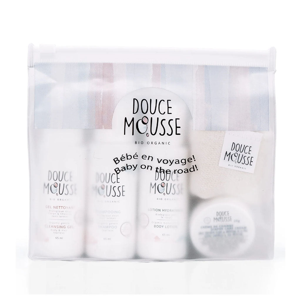 La trousse de soins biologiques Bébé en Voyage! de Douce Mousse vous accompagnera dans tous vos déplacements avec votre bébé. La trousse rassemble un gel nettoyant, un shampoing, une lotion hydratante, une crème de change et une lingette 100% coton biologique.